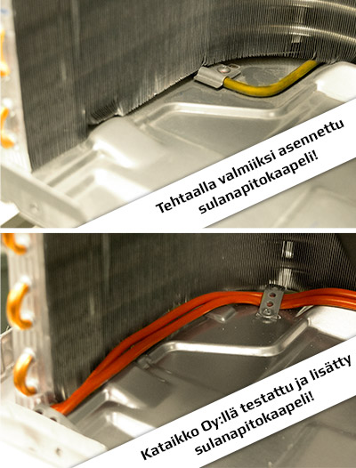 Kataikko Oy:n tekninen tuki on saanut useita reklamaatioita Mitsubishi Electric FH –VEHZ sarjan ilmalämpöpumppujen ulkoyksikön kennon jäätymisongelmista. (ns. Nordic –malli). Ongelmat ovat usein lähtöisin kennoston etureunasta, johon tehtaalla asennettu sulanapitokaapeli ei yllä. (kuva tehdas asennettu vs. Aslak)